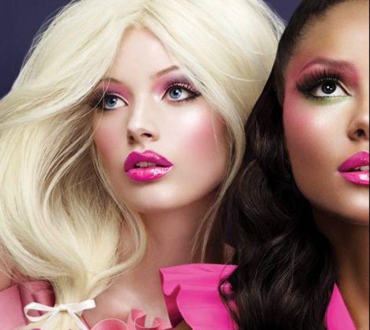 Конечно, главное в таком макияже — розовый цвет (от самого пастельного оттенка до фуксии), и его на лице обычно много. Он используется в тенях, помаде и румянах. Губы у Барби не только ярко-розовые, они ещё и блестят.