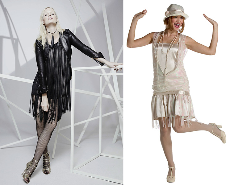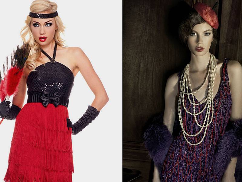 Первый признак чикагских образов – женственность и красота. Поэтому вам понадобится простое платье облегающего кроя с немного сниженной талией и множественным декором. Прежде всего, это густая бахрома, которой отделывают подол юбки или зону декольте. Другие варианты оформления: камни, бисер, блестки, кружева, мех.