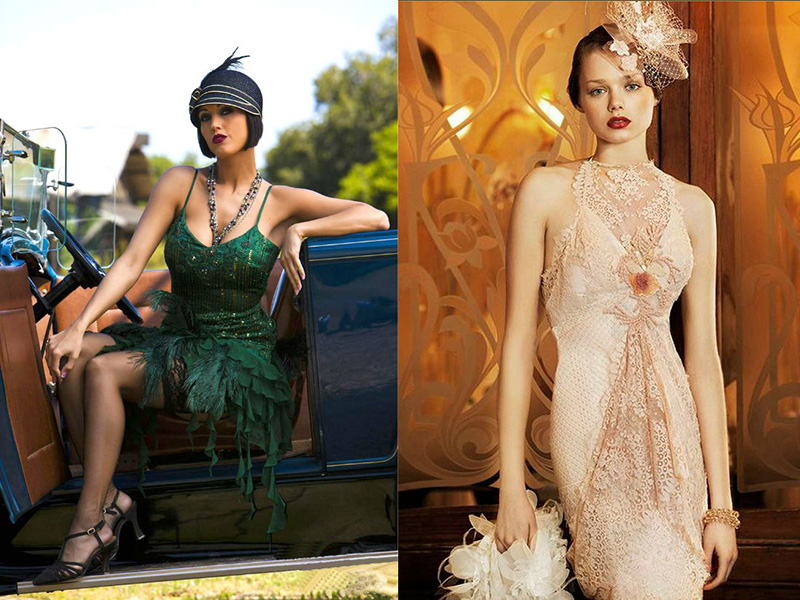 Наряд для торжества.Одним из самых главных неотъемлемых пунктов такого торжества является выбор нарядов для будущих молодоженов. Для жениха – это обязательно черный костюм, подтяжки, винтажные туфли, шляпа и сигара. Прическа – зачесанные назад и гладко уложенные с помощью косметических средств волосы. А вот пышное белоснежное платье невесты вряд ли будет смотреться на празднике уместно. В этом случае лучше подойдет длинное зауженное платье бежевого оттенка. Обязательными аксессуарами для молодой являются перчатки, чулки, украшения из жемчуга и боа или меховая накидка. Не стоит забывать о прическе в стиле “Холодная Волна” и ярком макияже, в частности, красной помаде на губах.