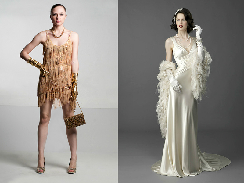Свадебные платья в стиле Чикаго далеки от привычной классики. У невесты есть возможность импровизировать в создании наряда. Стильно смотрится приталенное платье длиной чуть ниже колена, сужающееся книзу. Особенно эффектно выглядит модель с низкой талией из блестящей струящейся ткани. К свадебному наряду подходят белые или телесные чулки в сеточку, высокие узкие перчатки из шелка или кружев. Пушистое боа и нить жемчуга сделают образ невесты вполне завершенным.