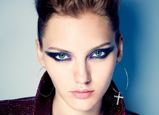 Сверху на темные наносят тени более яркого цвета: темно-синего, зеленого, графитового. Дерзкий макияж трудно представить без нанесения при помощи темных теней толстой линии вдоль нижнего века.