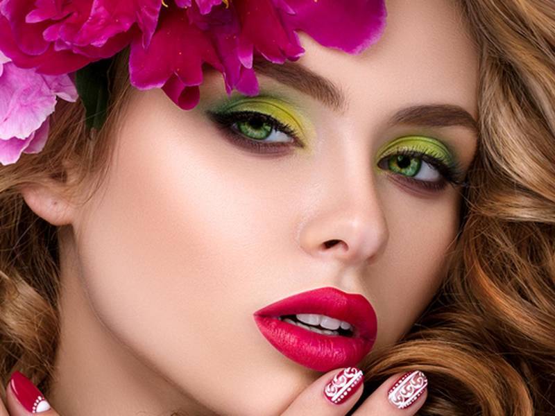 - Отлично подчёркивают зелёные глаза красные, розовые, кирпичные оттенки – они содержат красный цветовой пигмент, который выступает на контрасте с зелёным и тем самым его выделяет.
