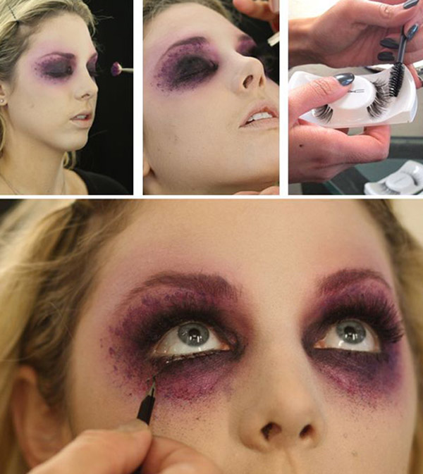 - На подвижное верхнее веко и под глаза наносим черные тени и немного небрежно растушевываем (слой черных теней должен быть достаточно плотным).