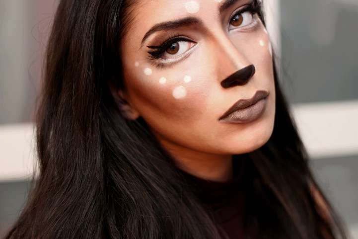 Для мейк-апа потребуются тени, помада и консилеры в коричнево-бежевых тонах. Светлые пятнышки наносятся кремовыми тенями, а нос и стрелки у глаз оформляют красками цвета горького шоколада.