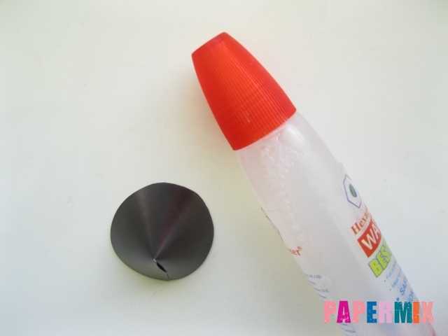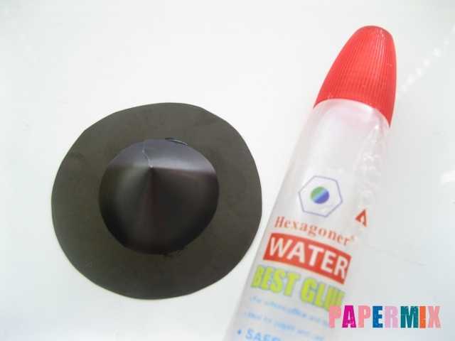 Наносим канцелярский клей по всему нижнему краю конуса по часовой стрелке и прикладываем фигуру на самый центр большой черной окружности. Прижимаем конус к окружности для закрепления.