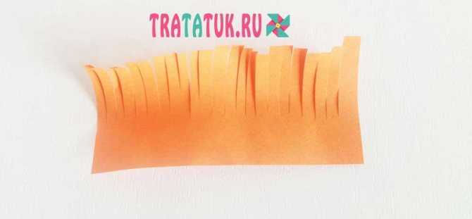 Чтобы сделать метлу и волосы, одну широкую сторону оранжевой бумаги нарезаем мелкими полосочками, немного не доходящими до конца.