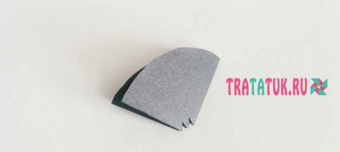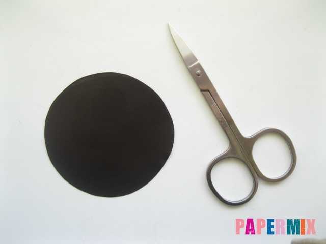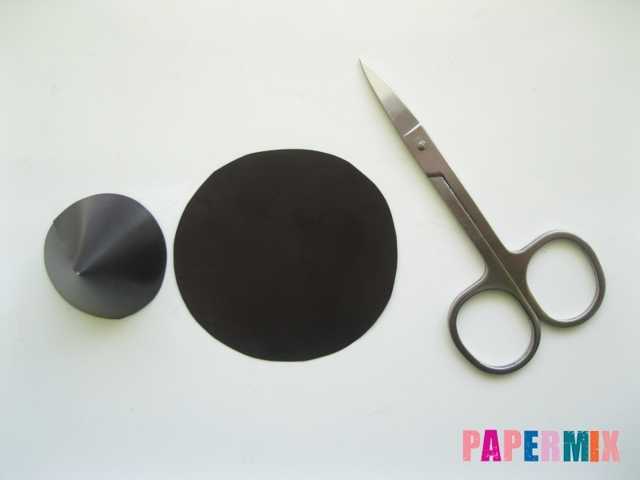Сначала делаем туловище, для чего сворачиваем большой черный полукруг и заклеиваем стороны. Затем складываем три раза черный круг, из которого получится шляпа, вырезаем срединку и делаем зубчики.
