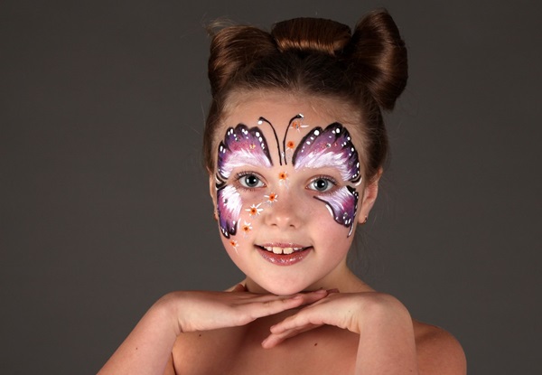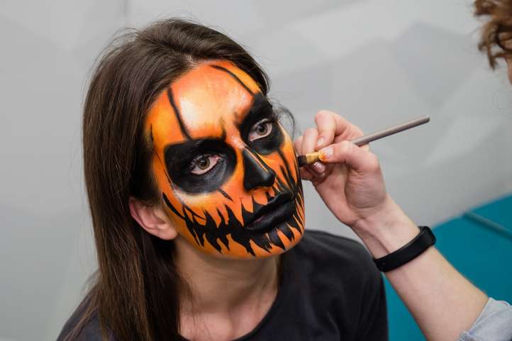 Основной фон при таком мейк-апе – оранжево-желтый. На него наносят черные линии, тени вокруг глаз и рта. Можно добавить кокетливый зеленый хвостик или изображение паучка на щеке.