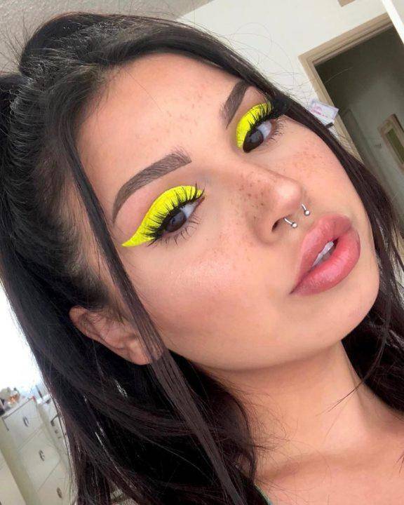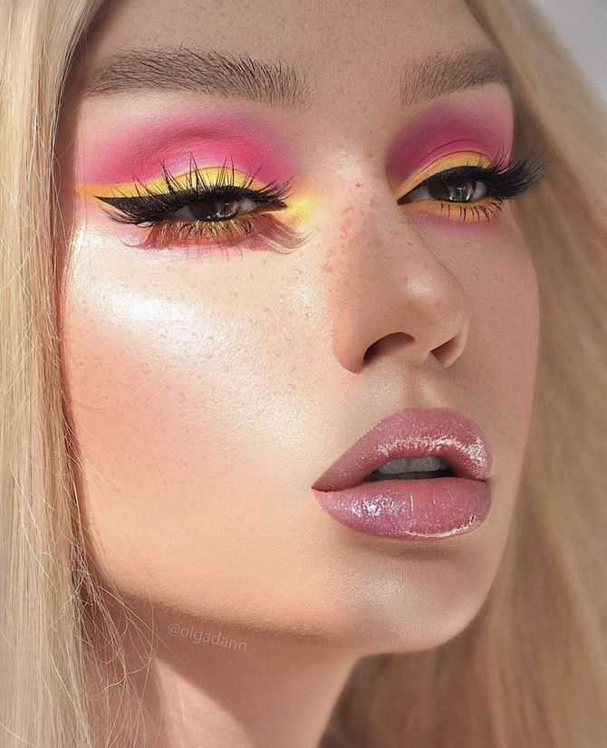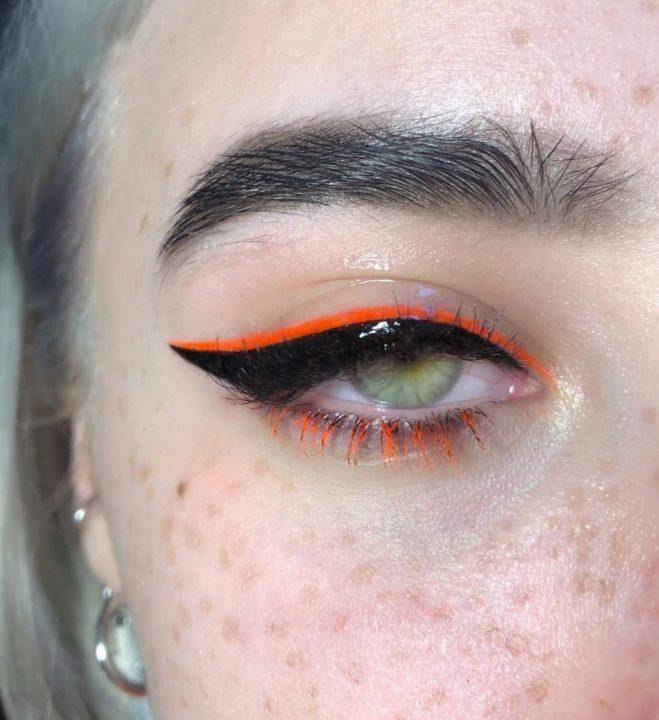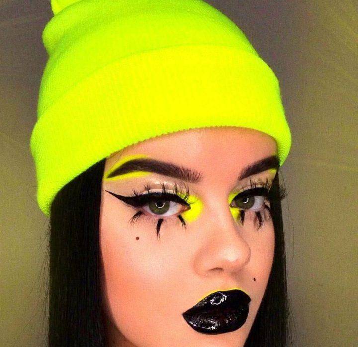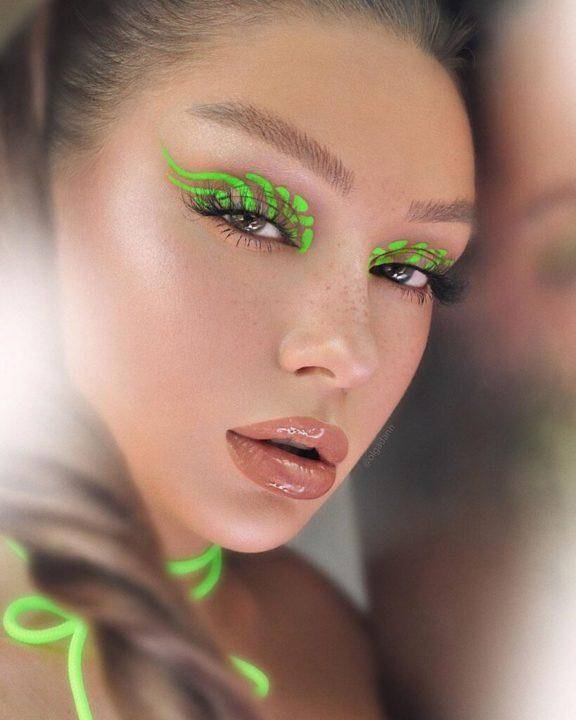Неон возглавляет список самых главных трендов осени 2021 года. Под неоном подразумеваются косметические средства, с помощью которых можно имитировать яркие и кислотные цвета. Чаще всего такой эффект достигается с помощью белого карандаша и теней.