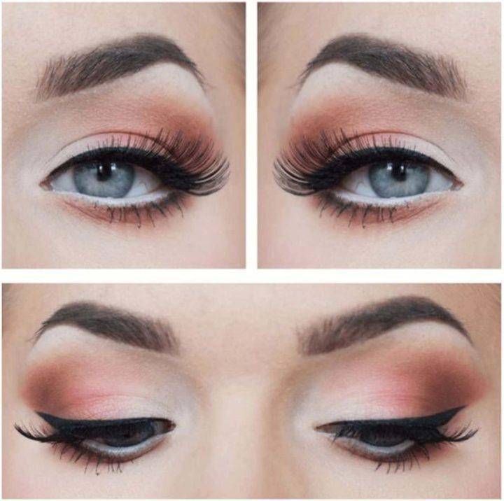 Розовый цвет придает образу романтики, но выбирать стоит лишь светлые тона. Не наносите много теней, иначе веки будут казаться воспаленными.