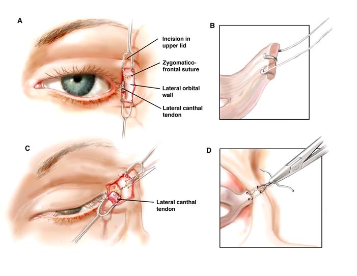 Техника выполнения кантопексии аналогична технике, которую используют при кантопластике, но сухожилие в данном случае остается на своем прежнем месте.