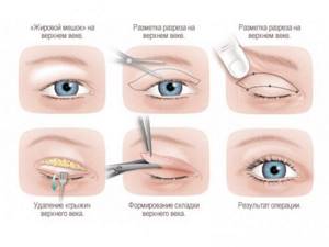 Теперь подробнее, как проходит операция при блефаропластике верхних век. Врач делает разрез по линии верхнего века, выкачивает жир, вырезает лишний участок кожи. После проделанных манипуляций, он зашивает разрез и приступает к нижнему веку, если требуется и его коррекция.