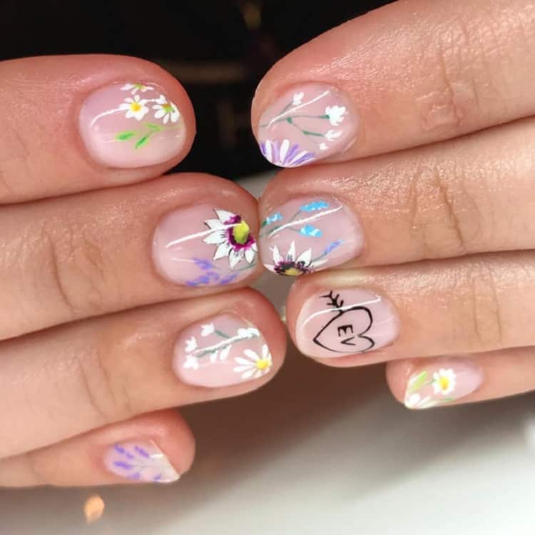 Цветочные мотивы. Нанесите на ноготок прозрачный лак. Поверх него любимым цветом проведите пару мазков. Это будут лепестки нашего цветка. Такой маникюр подойдет в школьное время.