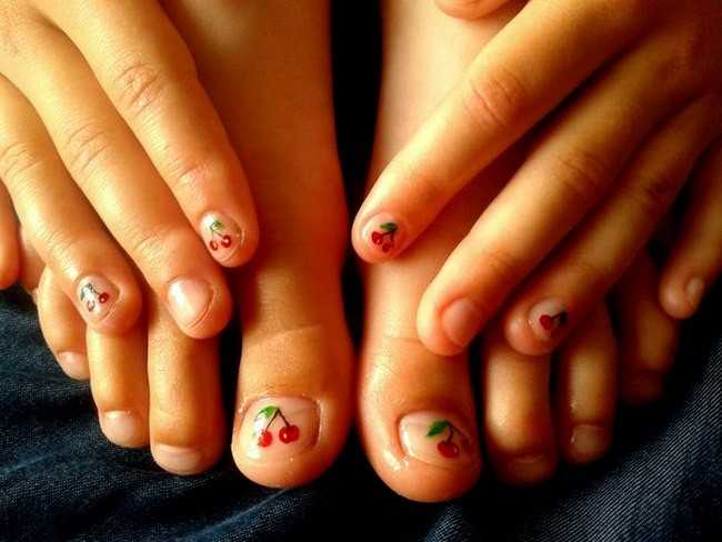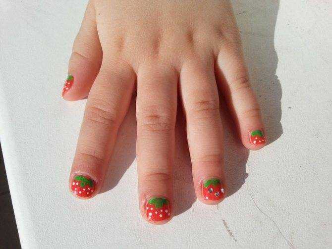 Однако довольно забавно смотрятся ноготки в виде клубничек или божьих коровок. Часто для детского маникюра используют всевозможные наклейки, с помощью которых можно быстро разукрасить каждый ноготь, например, изображением любимого героя мультфильма.