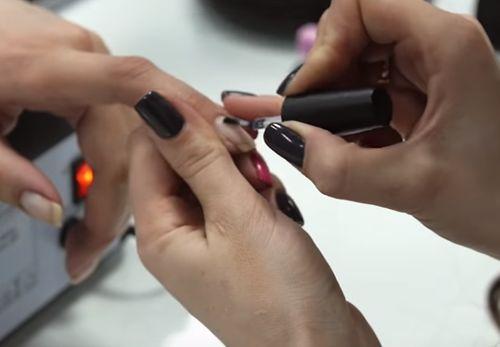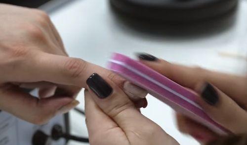 Осторожно устранить кутикулу посредством палочки из пластика либо дерева, а также придать ногтевой пластине желаемую длину и форму, используя для данных целей пилочку. Поверхность каждого ногтя шлифуется пилочкой, чтобы гель шеллак смог лечь более равномерно и аккуратно