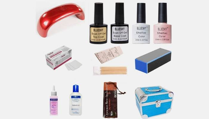 В таком наборе для шеллака в домашних условиях присутствуют только самые необходимые инструменты и материалы. Он подойдет начинающим девушкам, которые впервые решились самостоятельно сделать такой маникюр дома. Как правило, в наборе есть защитное средство, закрепитель