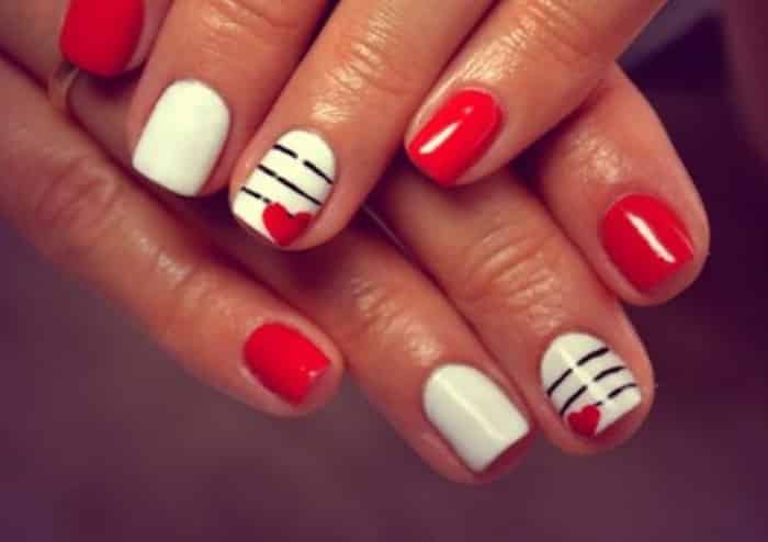 Тандем красного и белого цветов смотрится не так категорично и броско, как предыдущее предложение, но также пользуется немалой популярностью и имеет множество вариаций сочетания в маникюре. В арсенале красно-белых дизайнов оригинальный френч и лунный маникюр, изумительный нейл- арт с цветами и другими видами изображений на акцентных ноготках. А также красно-белая растяжка, мраморные узоры и многие другие предложения. Классический красный в этом случае, вне зависимости от того, к каким из оттенков палитры он относится, смотрится более благородно и нежно. В результате такое оформление маникюра прекрасно вписывается в любой из женских образов и подчёркивает женственность.