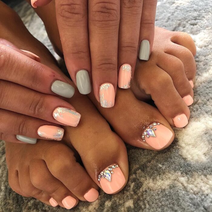 Многие барышни не представляют своего маникюра и педикюра без использования в дизайне блёсток или сверкающих декоративных украшений. Нейл-дизайнеры рекомендуют в таких случаях не отказывать себе любимой и немного поэкспериментировать с подобными идеями. Чтобы создать более лаконичный, но блестящий дизайн, можно использовать в маникюре-педикюре один из видов втирки. Не менее красиво смотрятся выделенные блёстками глиттера или узорами из страз акцентные ноготки на больших пальцах ног и ноготки на безымянных пальцах рук. Расположение декора при этом не обязательно должно дублироваться. Также можно использовать декоративные украшения лишь для оформления маникюра. Для педикюра в этом варианте следует присмотреть лаконичное оформление с использованием таких же оттенков лака.