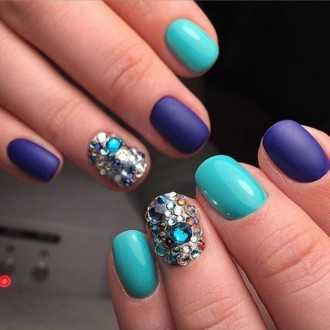 Синий цвет выглядят неимоверно притягательно, здесь стразы можно сочетать с любыми изображениями. В моде цветочная роспись, линии, звездочки, морские узоры, точки, клетка. Также красиво будет смотреться союз с френчем или лунным дизайном.