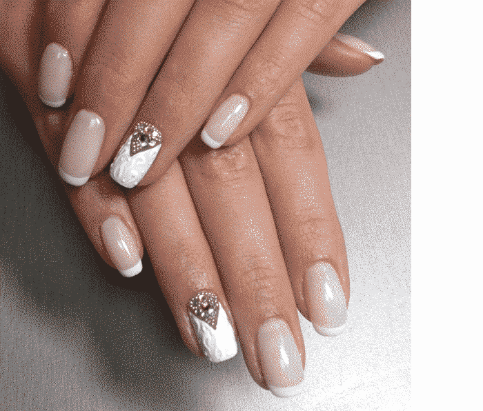 Белые узоры на прозрачной основе смотрятся сдержанно и одновременно стильно. Такой минимализм часто используется в свадебном маникюре, особенно в сочетании с различными украшениями – стразами, блесками и пр.