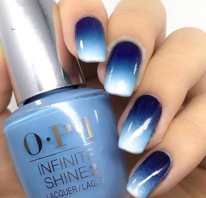 Любой оттенок синего можно смело использовать вместе с белым. Отлично смотрится в технике градиент, а также удачный вариант для различных типов росписи.