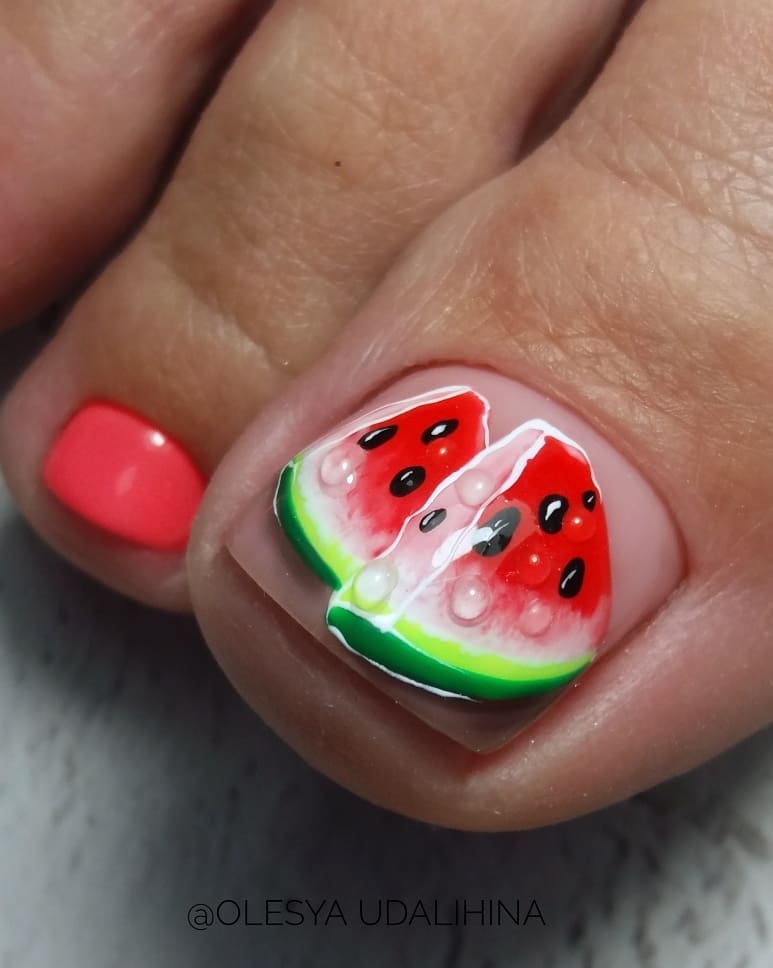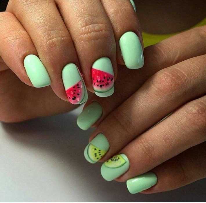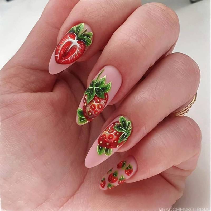 Хитом летнего нейл-арта 2024 остаются рисунки фруктов, ягод и других вкусняшек, как например мороженое и напитки. Наиболее красочно в маникюре и педикюре на лето будут смотреться сочные и аппетитные плоды. Особенно трендовыми будут клубника, арбуз, ананасы и цитрусы, рисунки которых больше популярны в разрезе и мультяшном стиле.