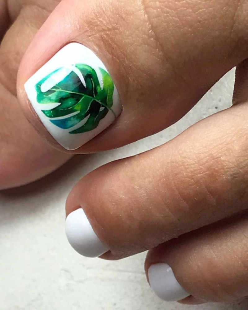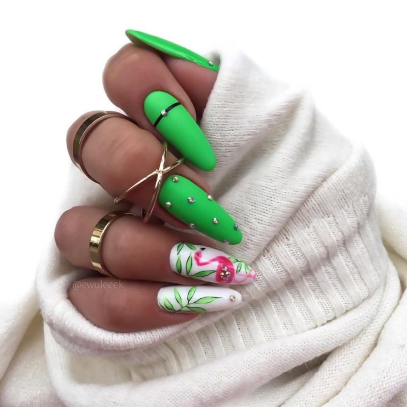 В летнем дизайне маникюра и педикюра 2024 не обойтись и без насыщенных рисунков зеленых листьев и веточек тропических растений. Особенно модно сочетать подобный нейл-арт с белым маникюром и педикюром. Экзотический принт часто сочетают и с рисунком розового фламинго, что смотрится весьма привлекательно и интересно.