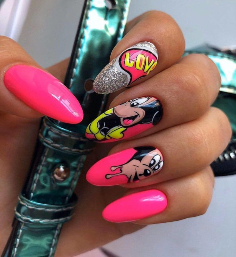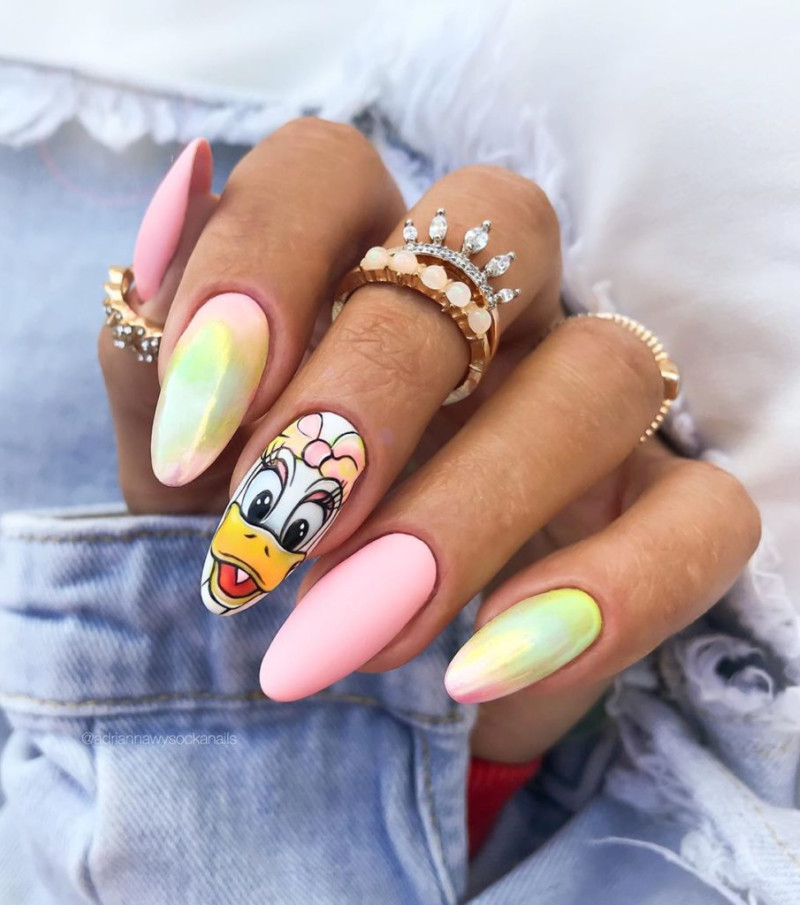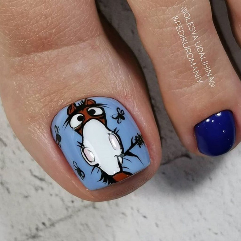 Веселые и забавные мультипликационные герои тоже не дадут скучать летнему маникюру и педикюру 2024. Подобные рисунки могут быть слишком яркими для офисного стиля, поэтому их чаще выбирают для повседневных образов, и особенно в маникюре и педикюре в отпуске.