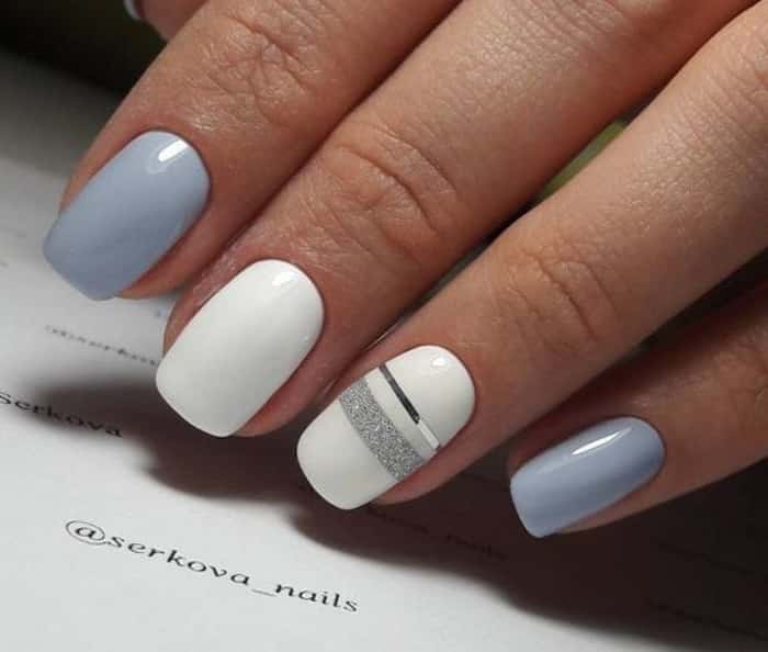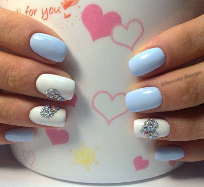 Подойдет для маникюра по любому поводу. Сине-белый дуэт отлично смотрится с серебристыми стразами и блесками.