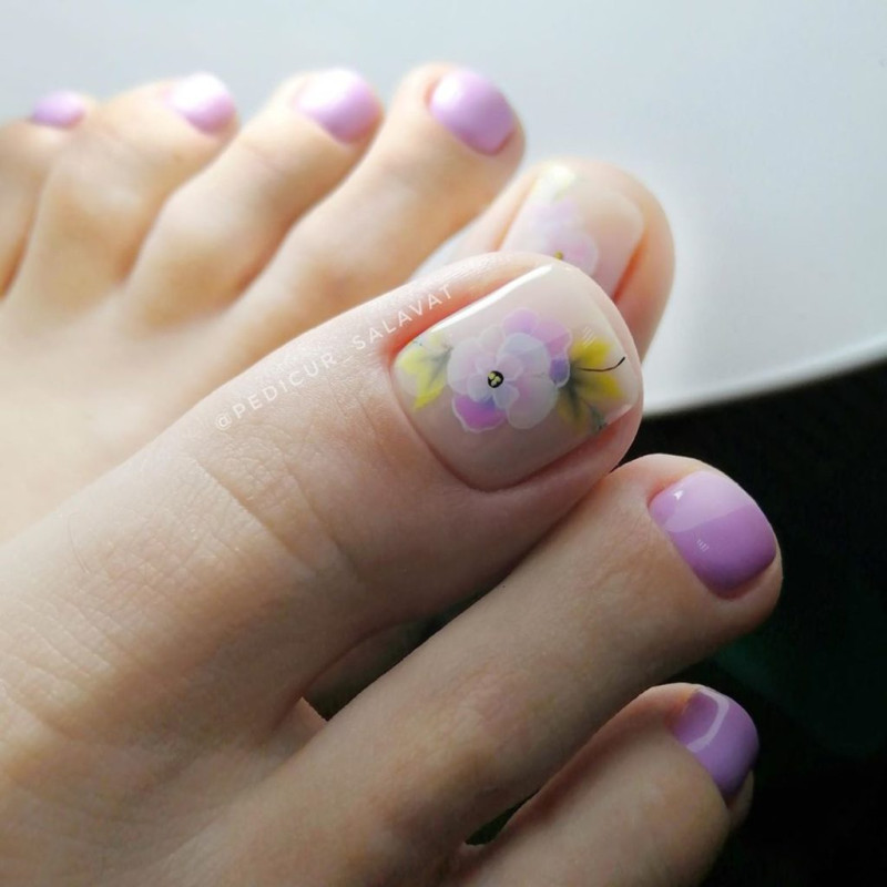 Также помните, что при нанесении маникюра все пальцы равны, и любой из них можно сделать акцентным, украсив сложным рисунком или массивным декором. В то время как при нанесении педикюра «главным» считается именно большой палец, поэтом весь сложный дизайн, как правило, достается ему. Остальные же пальчики покрываются гель-лаком сопутствующих оттенков.