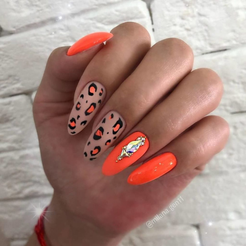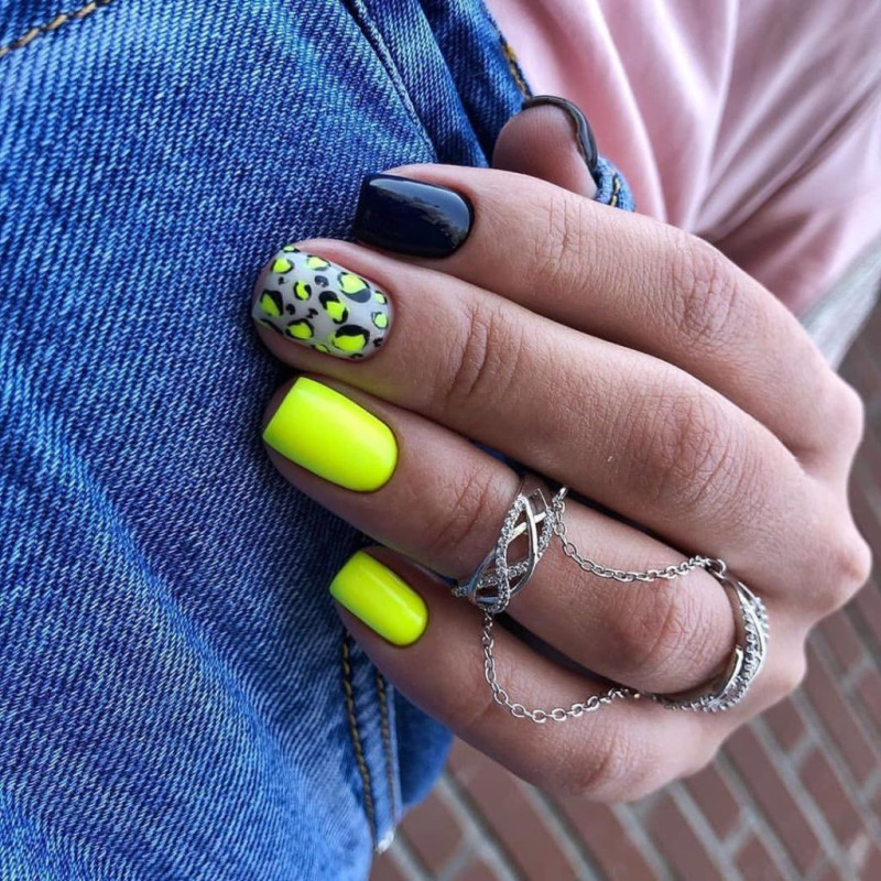 Оригинальные и стильные интерпретации в летнем маникюре и педикюре 2024 получил трендовый леопардовый и змеиный принт. Сочетание хищного узора с яркими оттенками, в том числе и неона, оказались очень крутыми и гармоничными, что стало подходящим и для летнего нейл-арт-дизайна.