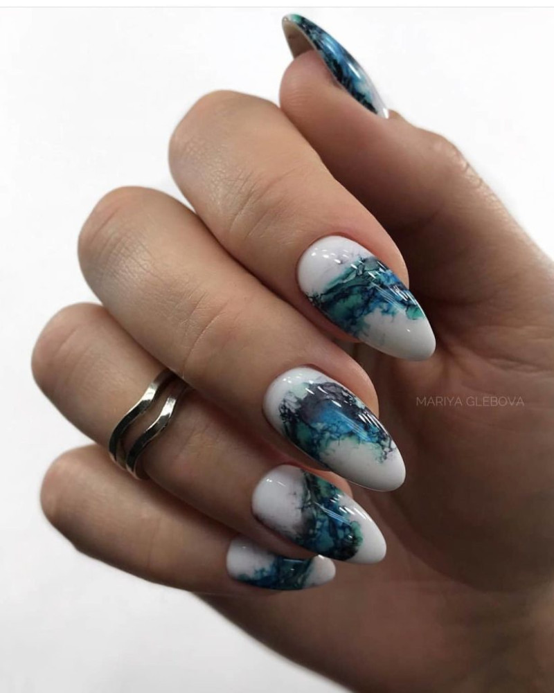 Эталоном стиля является маникюр, сделанный с использованием холодных мраморных узоров. Ногти при этом выглядят необычно, но соответствуют деловому стилю. Мраморные узоры хорошо сочетаются с нюдовыми оттенками.