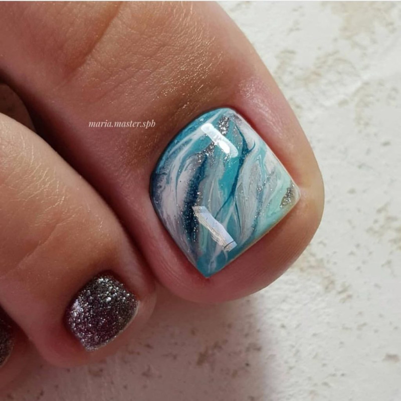 Эффект натурального камня давно завоевал место в модных нейл-трендах 2024 года. В летнем маникюре и педикюре дизайн в стиле «текстуры» очень разнообразный. В тренде и мраморный узор и размытые рисунки, напоминающие морские волны, и красивые разноцветные текстуры с уникальным и неповторимым дизайном.
