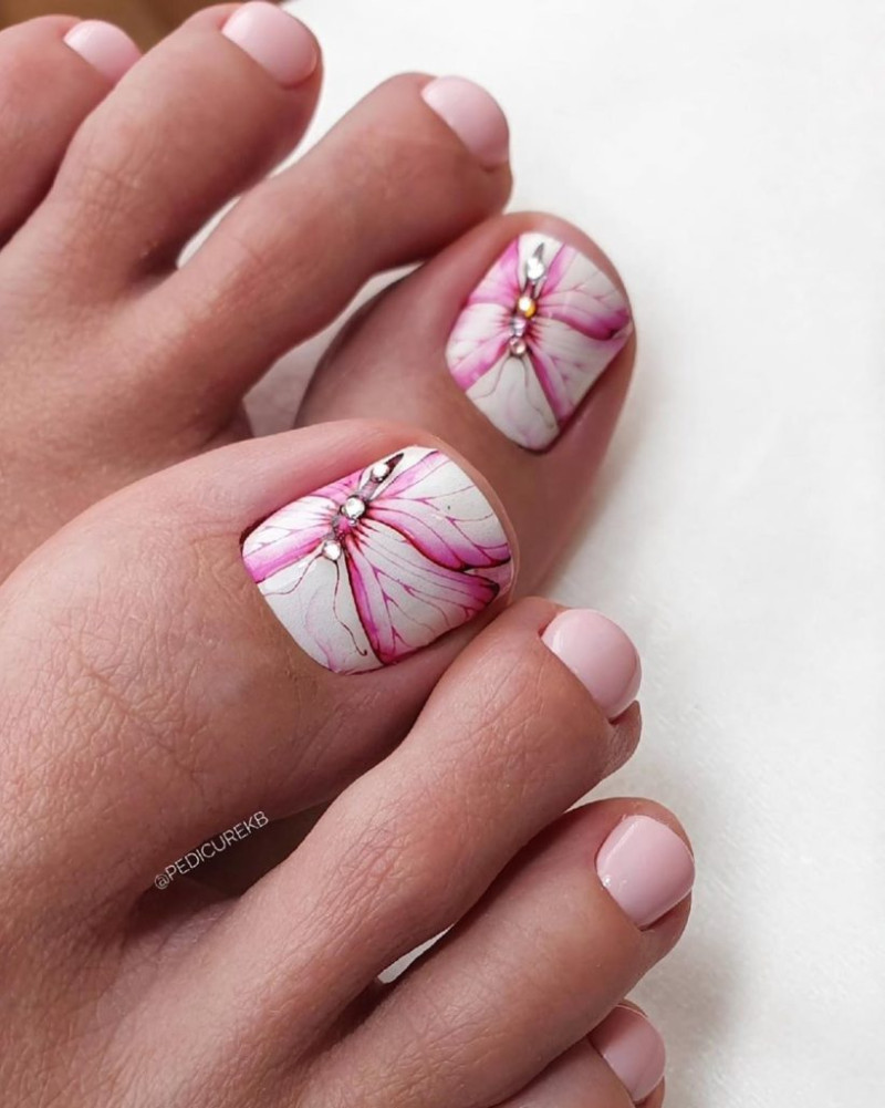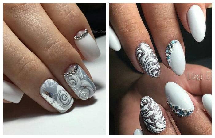 Одним из самых крутых вариантов считается белый маникюр и педикюр со стразами. Сюда также можно добавить цветы в технике акварель. Необычные разводы будут смотреться нетривиально и эстетично. Стразы лучше добавлять у края ногтевой пластины в небольшом количестве.