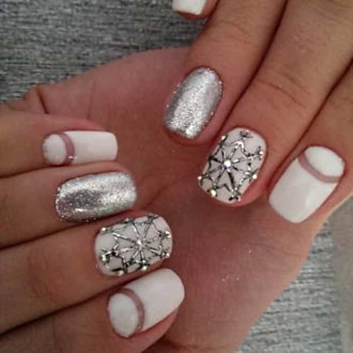 Морозное утро или искрящийся снег – это лишь часть возможных ассоциаций, которые может вызвать сочетание серебристого лака с белым. Они могут сочетаться по-разному, но наиболее популярно – френч с белой основой и серебристым кончиком ногтя, ну или лунный маникюр. Вариантов тандема уйма, найти свой поможет профессионализм мастера нейл-арта.