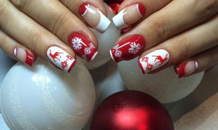 Красную роспись можно сделать на белом фоне, тогда получившийся рисунок будет ярко выделяться и не останется незамеченным. Часто используют тандем красно-белого для новогоднего маникюра и дизайна ко Дню влюбленных.