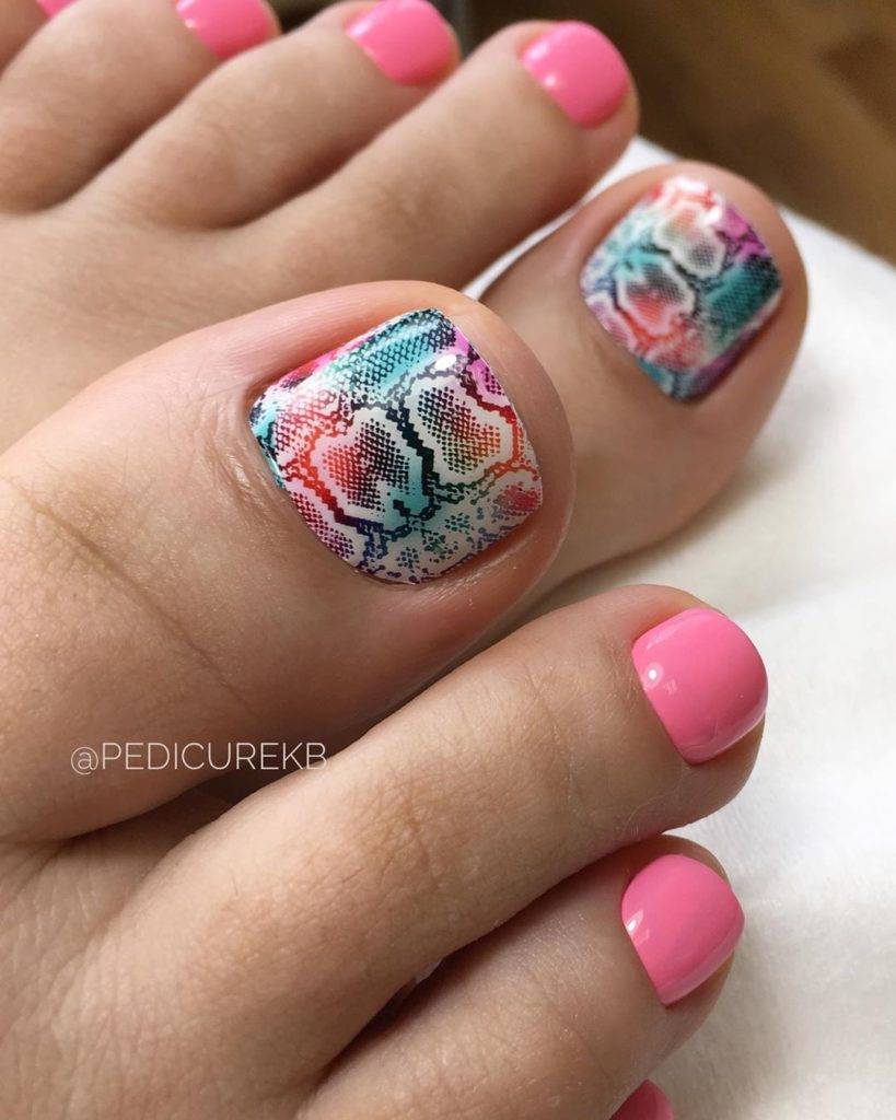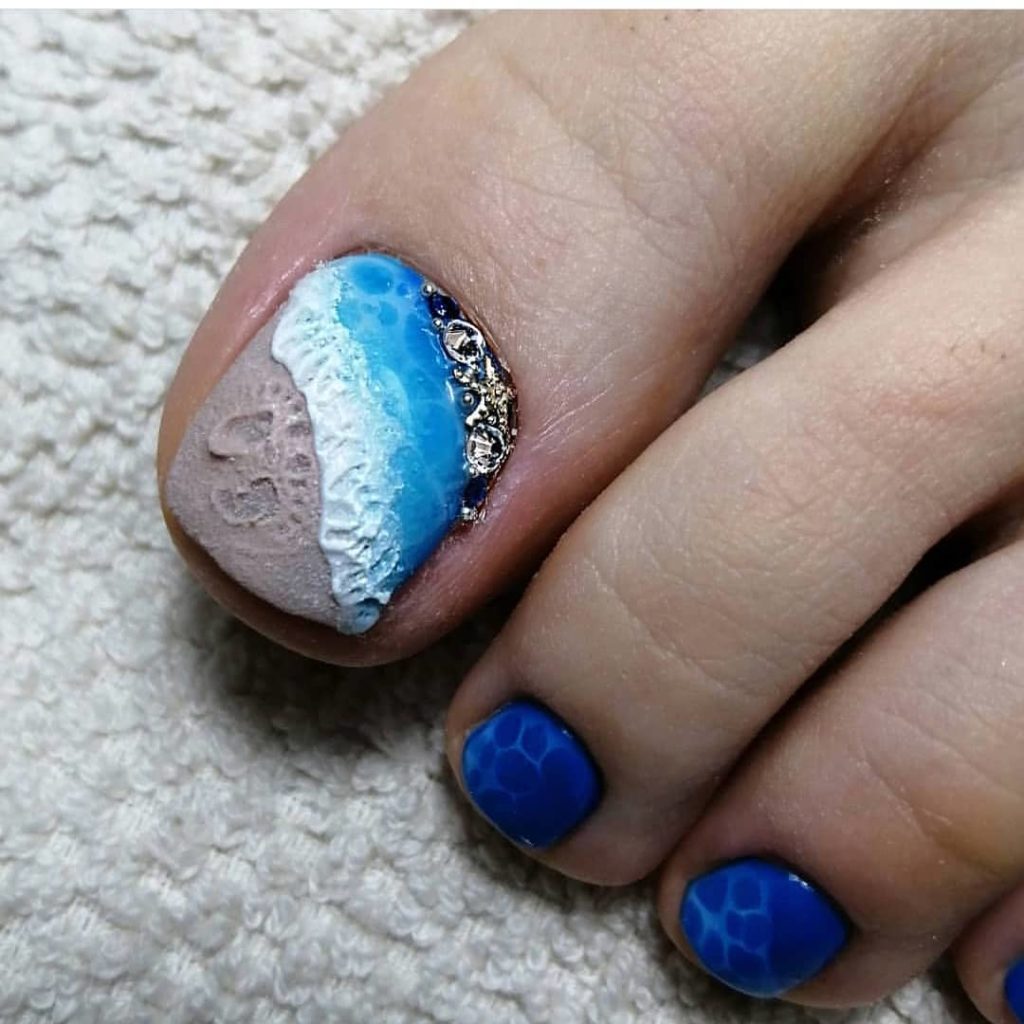 Также помните, что при нанесении маникюра все пальцы равны, и любой из них можно сделать акцентным, украсив сложным рисунком или массивным декором. В то время как при нанесении педикюра «главным» считается именно большой палец, поэтом весь сложный дизайн, как правило, достается ему. Остальные же пальчики покрываются гель-лаком сопутствующих оттенков.