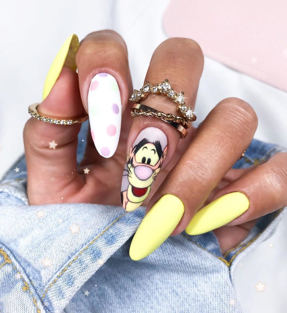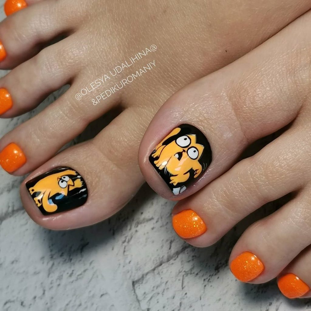Веселые и забавные мультипликационные герои тоже не дадут скучать летнему маникюру и педикюру 2024. Подобные рисунки могут быть слишком яркими для офисного стиля, поэтому их чаще выбирают для повседневных образов, и особенно в маникюре и педикюре в отпуске.