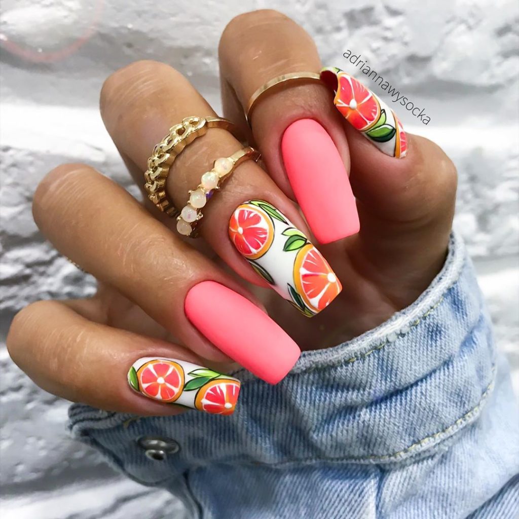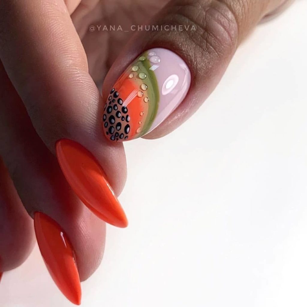Хитом летнего нейл-арта 2024 остаются рисунки фруктов, ягод и других вкусняшек, как например мороженое и напитки. Наиболее красочно в маникюре и педикюре на лето будут смотреться сочные и аппетитные плоды. Особенно трендовыми будут клубника, арбуз, ананасы и цитрусы, рисунки которых больше популярны в разрезе и мультяшном стиле.