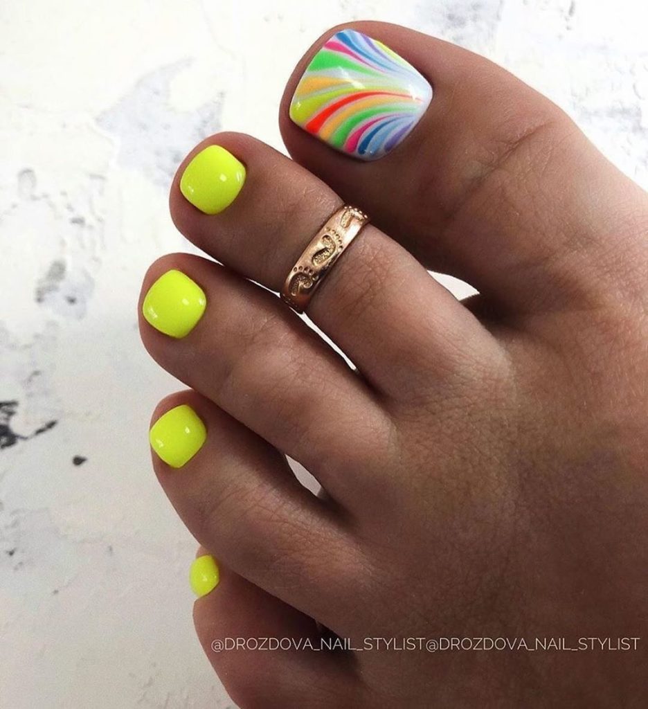 Необыкновенно яркие и насыщенные кислотные оттенки в летнем маникюре и педикюре 2024 чаще используются не для монохромного дизайна. В тренде абстрактные узоры с разноцветными неоновыми втирками, комбинированные с минималистическими рисунками или паутинкой. Модный неоновый педикюр и маникюр на лето больше напоминает радужный дизайн, который всегда поможет выделиться.