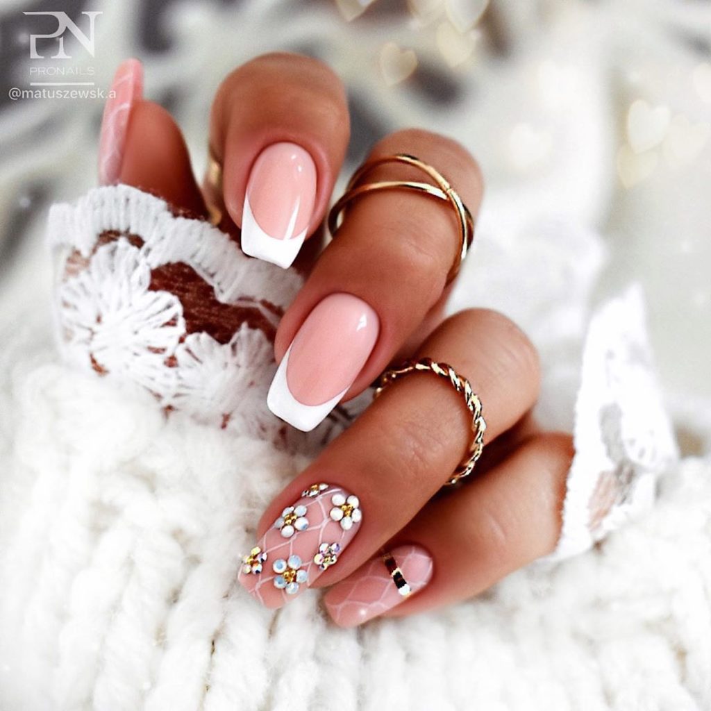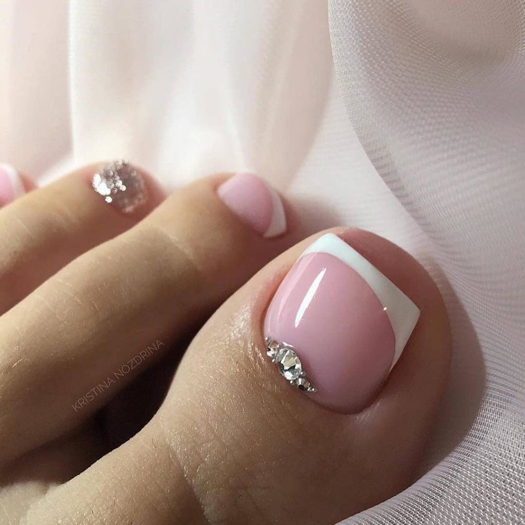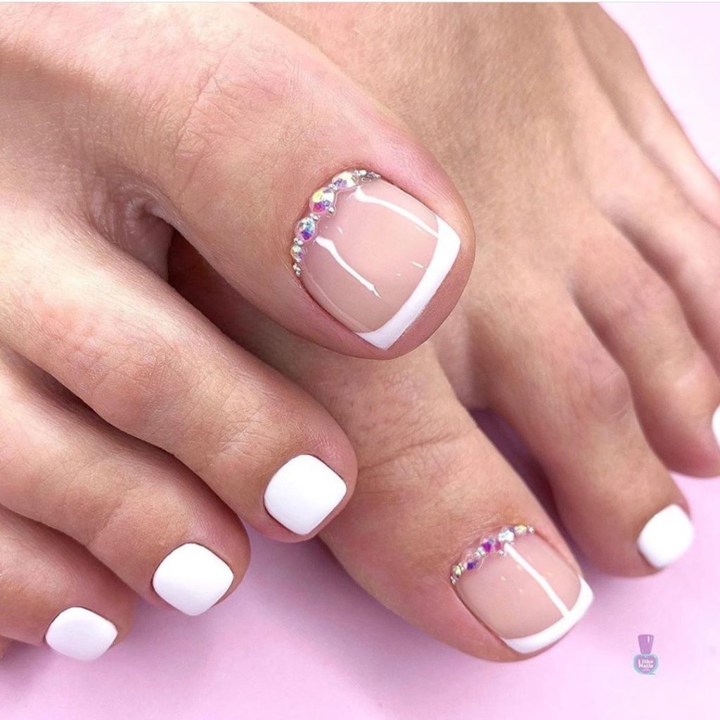 Одним из самых крутых вариантов считается белый маникюр и педикюр со стразами. Сюда также можно добавить цветы в технике акварель. Необычные разводы будут смотреться нетривиально и эстетично. Стразы лучше добавлять у края ногтевой пластины в небольшом количестве.