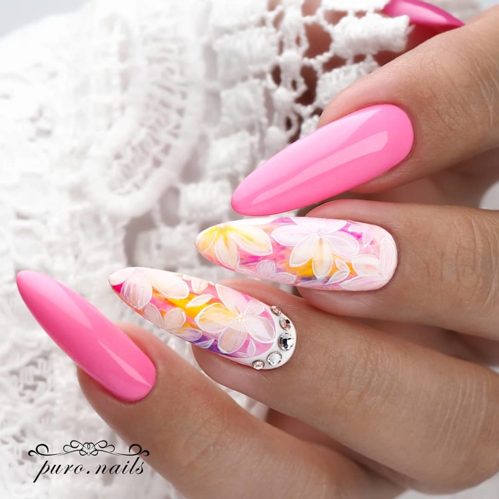 Красивые цветы на ноготках рук и ног никого не оставляют равнодушной уже который сезон подряд. Раньше цветочные узоры чаще сочетали с френчем и лунками. Этим летом модный маникюр и педикюр с цветами больше напоминает красочное полотно с цветочным принтов в винтажном стиле.
