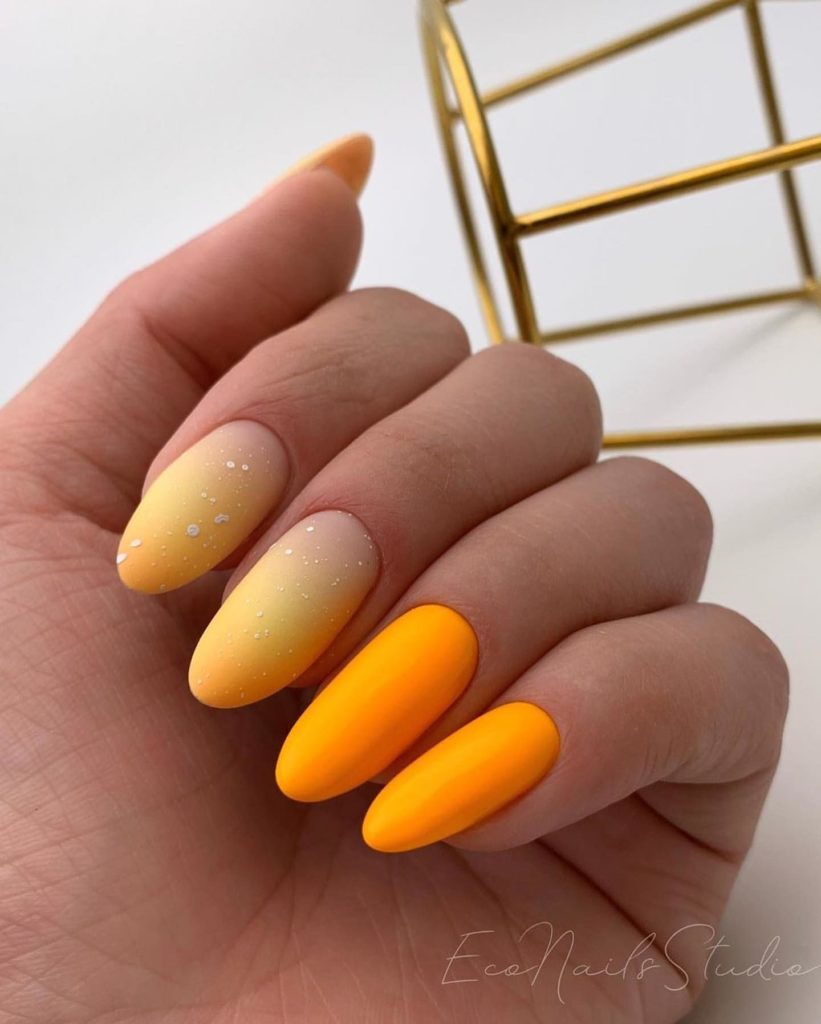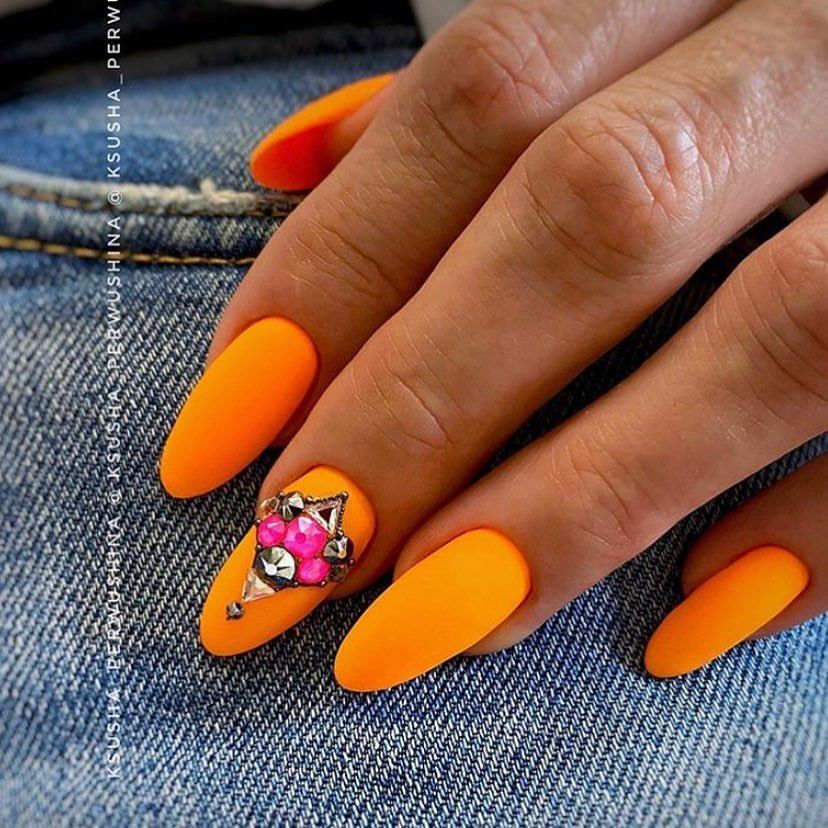 Если делать выбор в пользу однотонного дизайна маникюра и педикюра, то этим летом однозначно следует выдирать насыщенные и яркие оттенки желтого или оранжевого цвета. Эта солнечная палитра прекрасно сочетается с загорелыми ручками и ножками. Модный желтый и оранжевый маникюр и педикюр на лето 2024 точно не будет выглядеть скучно и однообразно. Сам цвет не позволит остаться без внимания.