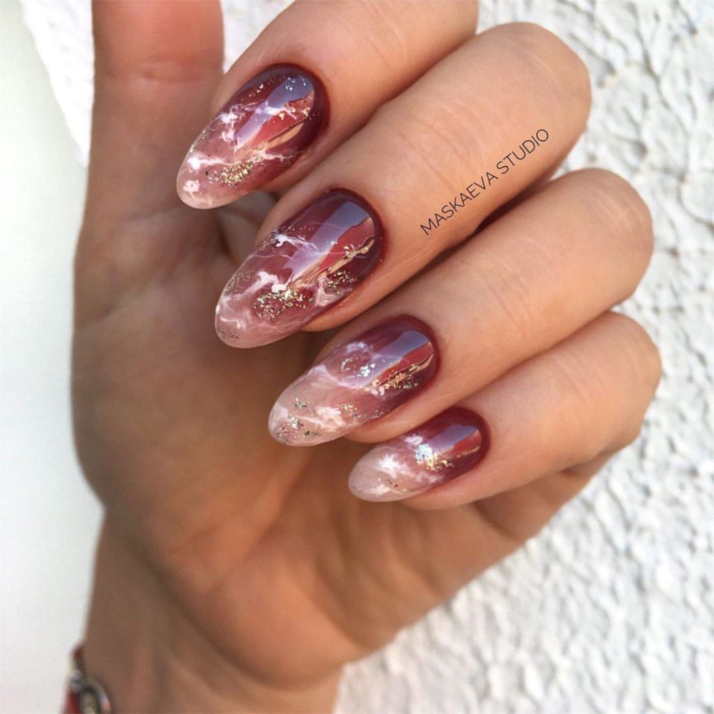 Эталоном стиля является маникюр, сделанный с использованием холодных мраморных узоров. Ногти при этом выглядят необычно, но соответствуют деловому стилю. Мраморные узоры хорошо сочетаются с нюдовыми оттенками.