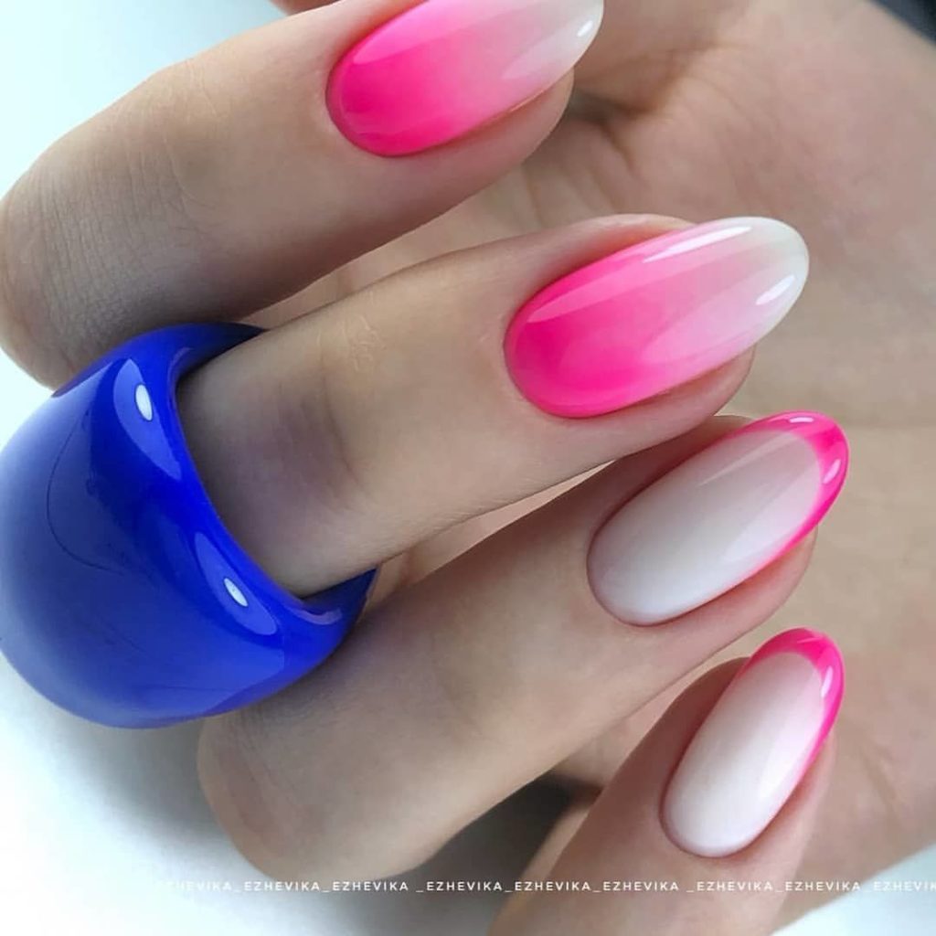 Омбре. Это наиболее универсальный вариант в данном случае. Ведь благодаря технике создания градиентного дизайна, результат уж точно не получится абсолютно одинаковым. Также, не стоит забывать и о правилах комбинирования цветов. Кроме того, что они должны гармонировать между собой, еще при этом и подходить под ваш гардероб.