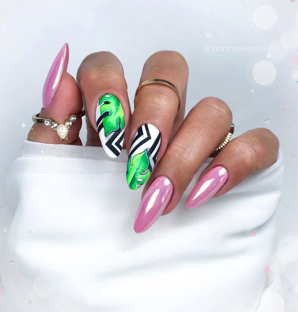 В летнем дизайне маникюра и педикюра 2024 не обойтись и без насыщенных рисунков зеленых листьев и веточек тропических растений. Особенно модно сочетать подобный нейл-арт с белым маникюром и педикюром. Экзотический принт часто сочетают и с рисунком розового фламинго, что смотрится весьма привлекательно и интересно.