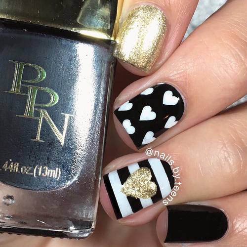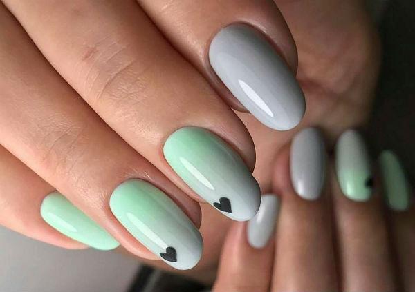Для любителей всего оригинального и необычного подойдет маникюр с сердечками в черных тонах. Рисунок можно изобразить на одном ногте, а оставшиеся покрыть блестками, пудрой и т.д.