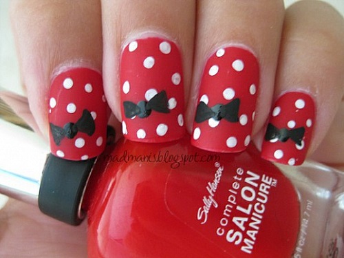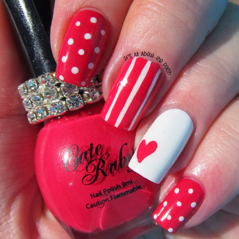 В доказательство этому, приведем несколько примеров. Так, как вариант, на ноготках средней длины всегда можно нарисовать большие сердца красного цвета, которые весьма органично будут смотреться в сочетании с пастельно-розовым лаком и крупным белым горошком: