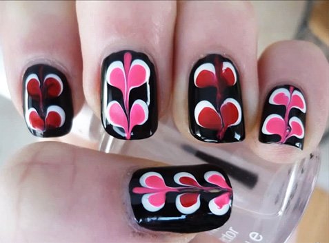 Розовый вариант сделает ваш образ нежным и женственным. Можно сделать розовым фон, но пару пальчиков прокрасить белым лаком. На розовом фоне изобразите черные сердечки, на белом — розовые. Получится прекрасный контраст.