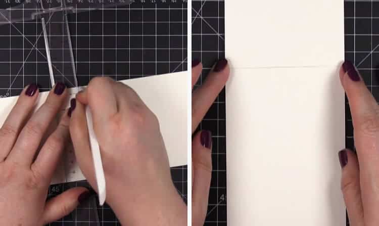 Возьмите банковскую карту и с помощью линейки проведите несколько раз по линии сгиба, чтобы «забить» бумагу посередине. Убедитесь, что вы прилагаете достаточно усилий, чтобы образовалась «вмятина» на бумаге. Это приведет к разрыву волокон бумаги, что облегчит сложение толстой бумаги пополам без образования складок.